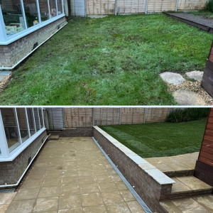 We installed a completely new drainage system. We then levelled out the garden from a slope into a split-level garden. This allowed us to install a good-sized patio and steps running up the garden. A retaining wall was built to divide the levels of the garden, whilst also adding a bit of character. To complete the garden transformation, we installed new turf in the newly raised lawn area.
